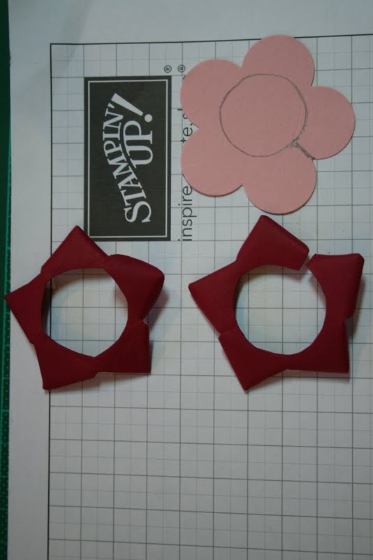 These two flowers have the same shape cut out of them. Cutting in between two petals on each punched shape cut out a circle the size of an Aussie 20 cent coin (which is a bit larger than a quarter). The circle is about an inch in diameter. I have drawn on the pink cardstock to show the shape of where to cut.